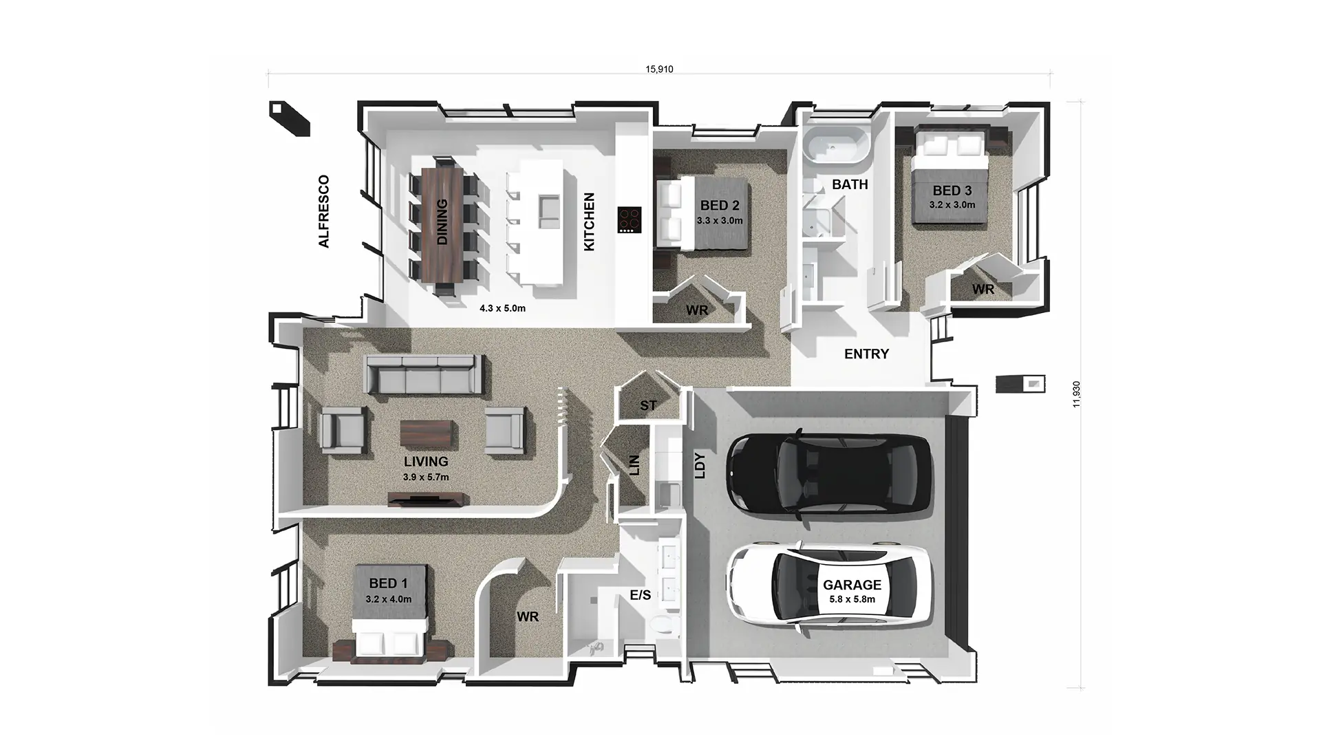 This custom-designed Paruhi plan makes the most of its site with three spacious double bedrooms, a master suite with a walk-in robe, and a bright north-facing alfresco area perfect for year-round living. A designer kitchen, slat curved feature wall, tiled ensuite shower, and double bowl vanity add a premium touch, while practical inclusions like a Daikin heat pump, Dawn block-out blinds, and a double garage with a laundry alcove ensure everyday comfort. Finished with shiplap cladding, Origin Shoreline bricks, and Colorsteel Longrun roofing, this home delivers both style and durability ready for move-in without compromise.